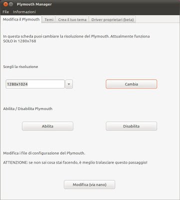 Grazie a Plymouth Manager potremo inserire la giusta risoluzione con 1 semplice click, per farlo (una volta installato) avviamolo da Applicazioni -> Strumenti di Sistema -> Plymouth Manager all’avvio basta scegliere la risoluzione corretta e cliccare su Cambia, confermare inserendo la password ed il gioco è fatto.