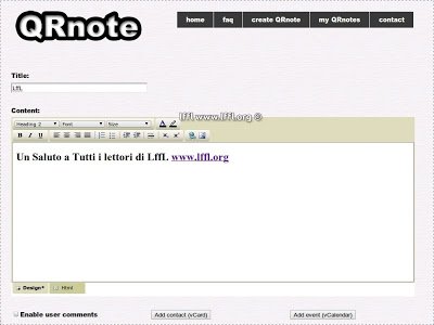 Qrnote è un semplice servizio web con il quale potremo trasformare un contenuto web da condividere con chi vogliamo attraverso il codice QR. Semplicissimo da utilizzare, completamente gratuito, permette di aggiungere i nostri contenuti attraverso un comodo editor WYSIWYG. L’editor offre tutte le più comuni e utili funzioni di formattazione tra le quali la scelta del tipo di font, colore, dimensione, allineamento ecc, inoltre potremo effettuare upload di immagini utilizzando un apposito editor HTML.