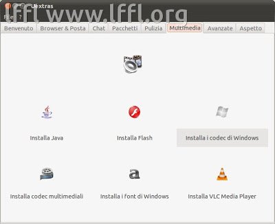 Per chi non la conoscesse Uextras è un’applicazione, scritta in Gambas, simile a Ubuntu Tweak, mediante il quale è possibile gestire, personalizzare, pulire ecc. il nostro Sistema Operativo. Semplice da utilizzare, una volta avviato (Applicazioni -> Strumenti di Sistema -> Uextras) ci consente di installare con un semplice click le più diffuse/importanti applicazioni divise per sezioni quali Browser & Posta e Chat. Inoltre possiamo installare Java, Flash, i codec di Windows, i codec multimediali e i font per Windows tutto con 1 solo click.