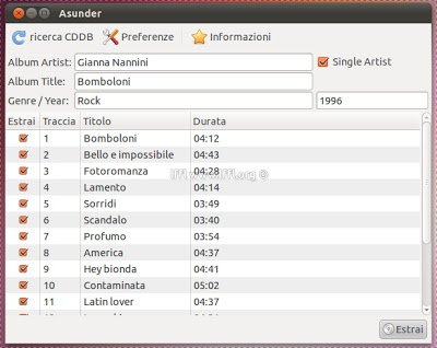 Nuovo rilascio per Asunder è un programma grafico per estrarre e codificare CD audio. Può essere usato per salvare tracce da CD audio. L’utilizzo è semplicissimo inseriamo il cd audio nel nostro lettore e avviamo l’applicazione e clicchiamo su preferenze e scegliamo la cartella dove estrarre i file e la codifica. Possiamo modificare il titolo del nostro album, autore ecc al termine clicchiamo su Estrai per convertire i nostri file audio.