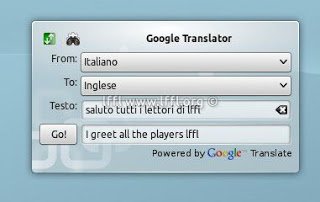 Google Translator è un semplice plasma applet con il quale potremo utilizzare con molta semplicità le traduzioni offerte da Google Translate direttamente dal nostro Desktop. Come per Google Translate basta inserire la lingua d’origine e la lingua che vogliamo venga tradotta, inserire il testo e cliccare su GO! Inoltre possiamo invertire le lingue semplicemente cliccando sull’icona verde in altro a destra.