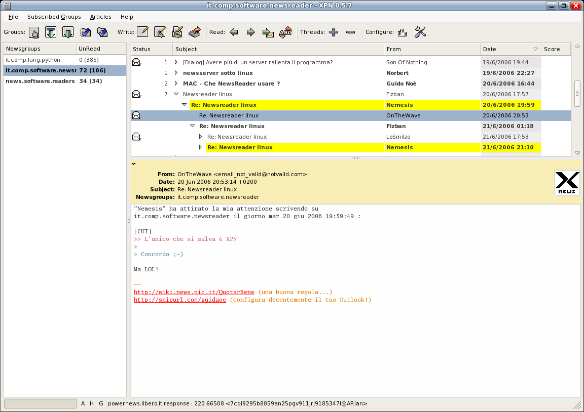 XPN è software libero, usa le librerie GTK ed è multipiattaforma (GNU/Linux, Altri Unix, MAC, Windows). XPN è un’applicazione estremamente stabile ed ha tutte le funzionalità che servono ad un newsreader. Usarlo è semplicissimo: dopo averlo lanciato (facendo click su xpn.py o lanciandolo da terminale), il programma chiederà la configurazione (bastano informazioni utente e server). Dopodichè dovremo sottoscriverci a dei gruppi e poi, cominciare a rispondere o creare articoli usando i tasti “Nuovo“.