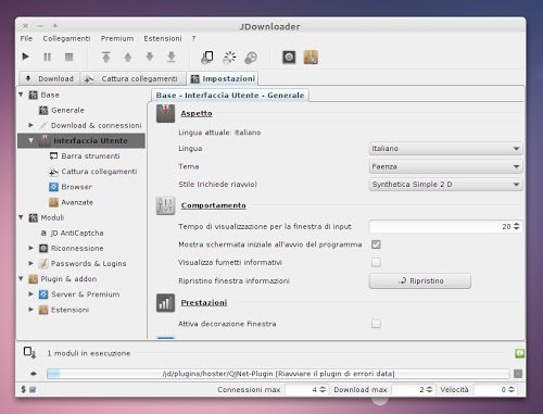 Fatto questo avviamo jDownloader e andiamo su Impostazioni e sulla sinistra clicchiamo su Interfaccia Utente, su Aspetto cambiamo da default in Faenza e riavviamo.