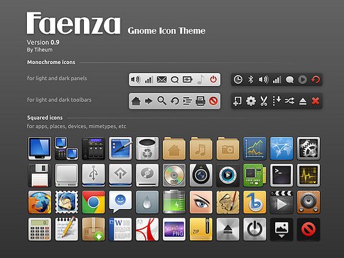 Il set di icone Faenza fornisce icone monocromatiche per i pannelli, le barre degli strumenti e pulsanti, invece icone colorate per i dispositivi, applicazioni, cartelle, file e voci del menu di Gnome. La nuova versione 0.9 aggiunge il nuovo tema “darkest” inoltre aggiunge le icone anche per nuove applicazioni e la nuova icona per Google Chrome.
