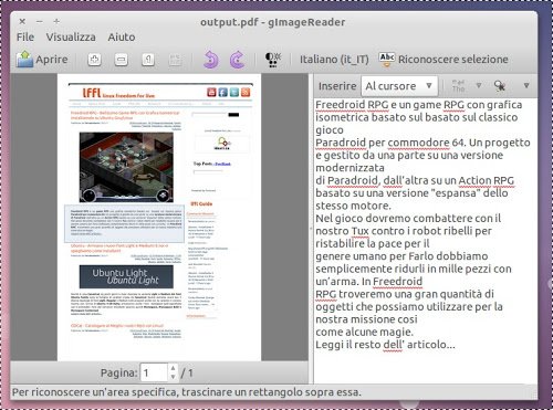 L’utilizzo è semplicissimo avviamo l’applicazione da Applicazioni > Grafica > gImageReader una volta avviata clicchiamo su “OpenImage” e selezioniamo il Documento Pdf o l’immagine da scansionare, selezioniamo delle aree particolari (in caso si voglia scansionare una parte dell’immagine o documento) e impostiamo la lingua di riconoscimento.