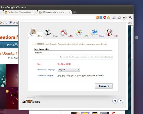 Sci2ools è un estensione per Google Chrome la quale basta un semplice click sull’icona dedicata che andrà a porsi accanto alla bara degli indirizzi, con la quale potremo accedere rapidamente a tutti gli utilissimi servizi web proposti da Sciweavers, tra questi il servizio di OCR, un editor di equazioni matematiche, oltre ai convertitori con i quali agiremo su file di testo, documenti PDF, immagini, e molto altro ancora.