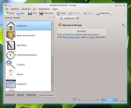 Skrooge è un gestore di finanze personali, specifico per ambiente desktop KDE, che mira ad essere semplice e intuitivo. Con Skrooge possiamo tenere traccia delle nostre spese e redditi, categorizzare e generare grafici e tabelle. Con Skrooge potremo creare diversi account (magari uno per noi uno per la moglie ecc) da li potremo tenere traccia delle nostre entrate e uscite, verificare come sono spesi i nostri soldi e gestire i nostri investimenti e controllare come essi variano nel corso del tempo
