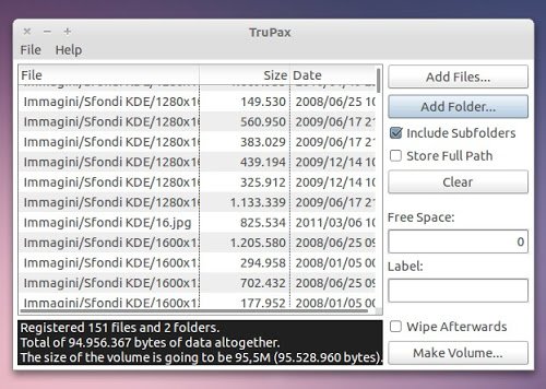 L’utilizzo è molto semplice, basta scaricare il file binario da QUESTA pagina, estrarlo e cliccare sul file trupax.gui e confermare , una volta avviata l’applicazione ci basta aggiungere file o cartelle per creare un disco cifrato protetto da TrueCrypt. Una volta selezionato il tutto, basta scegliere la quantità di disco libero (in MB) da riempire e specificare un nome per quel disco e cliccare su Make Volume