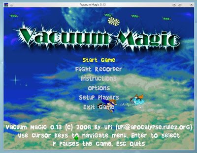 Vacuum Magic è una semplice gioco d’ azione / arcade di cui lo scopo del gioco è di utilizzare il campo vuoto magico per raccogliere cibo e difenderci contro i mostri. Il gioco si sviluppa in livelli con i quali dovremo cercare di raccogliere tutto il cibo (delle palline scure) per procedere al livello successivo. Si gioca con la tastiera utilizzando “le freccie” e premendo spazio per girarsi di 180 gradi. Il cibo e certi mostri possono essere sputati per usarli come proiettili contro altri mostri (inoltre raddoppieremo il punteggio), mentre i mostri rossi sono velenosi e bisogna evitarli.