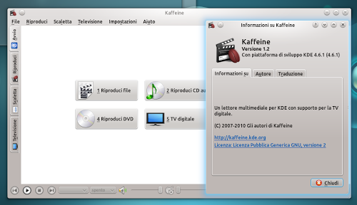 Kaffeine è un completo lettore multimediale ,specifico per Kde, basato sulla xine-lib. Pur supportando diversi backend Phonon, in modo predefinito usa Xine, il quale offre a Kaffeine una ampia gamma di tipi di file multimediali supportati e permette a Kaffeine di accedere facilmente a CD, DVD e flussi in rete. L’applicazione può tenere traccia di scalette multiple simultaneamente e supporta l’autocaricamento dei file con sottotitoli da usare durante la riproduzione di video.