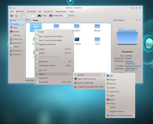 KDE permette di personalizzare una ad una le cartelle con molte alternative presenti però se le cartelle sono molte il lavoro può diventare lungo e monotono. A questo scopo è stato realizzato Color Folder il quale ci permette di colorare le nostre cartelle direttamente dal nostro menu constestuale con 1 semplice click. Inoltre ci permette di ripristinare la cartella al classico colore blu di default sempre con un click da menu contestuale.