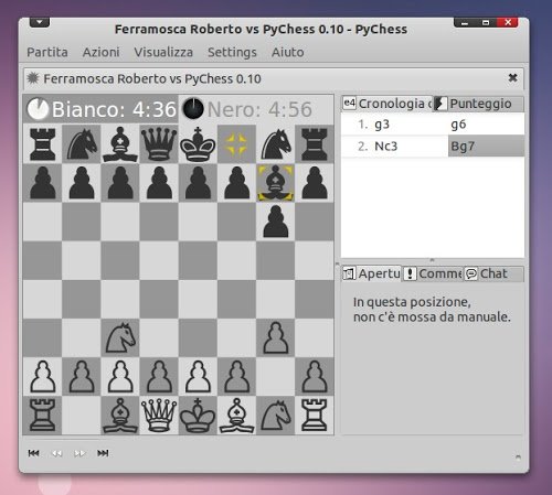 PyChess è considerato da molti il miglior gioco degli scacchi per Linux, scritto in GTK e Python, possiede tutte le caratteristiche che anche un neofita (come me) sia in grado di giocarci ad arrivare al professionista. PyChess offre la possibilità di giocare con un nostro amico o collega oppure contro il pc (con la possibilità di integrare diversi motori di gioco) oppure online attraverso la comunità del FICS con oltre 300 mila utenti attivi.