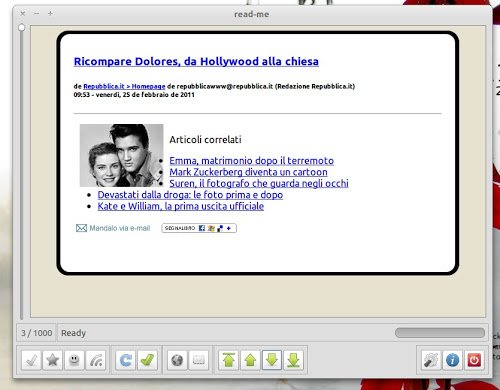 Semplice da utilizzare al primo avvio (Applicazioni -> Internet -> Read-Me) dovremo inserire i nostri dati per l’accesso e avremo subito avviati i nostri feed direttamente da Read-Me.