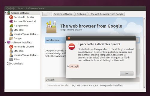 Da li non cambia molto tranne che magari la lentezza nell’avviarsi USC e la mancanza d’indicazione di quanti pacchetti di dipendenze andremo ad installare assieme al pacchetto, inoltre durante l’installazione di alcuni pacchetti tra questi Crome, Skype e molti altri ci appare la finestra d’errore la quale ci indica che “il pacchetto è di cattiva qualità“.