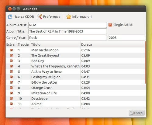 Asunder è uno dei migliori programmi per estrarre e codificare CD audio su Linux. Può essere usato per salvare tracce da CD audio. L’utilizzo è semplicissimo inseriamo il cd audio nel nostro lettore e avviamo l’applicazione e clicchiamo su preferenze e scegliamo la cartella dove estrarre i file e la codifica. Automaticamente Asunder cercherà in rete i dettagli dell’album e in pochi secondi avremo già il nostro album dettagliato pronto da estrarre. Possiamo modificare il titolo del nostro album, autore ecc al termine clicchiamo su Estrai per convertire i nostri file audio. Per chi utilizza Ubuntu 11.04 Natty avrà notato che è presente la versione 2.0, lffl (che collabora al progetto) abbiamo aggiornato l’applicazione alla nuova versione 2.1.