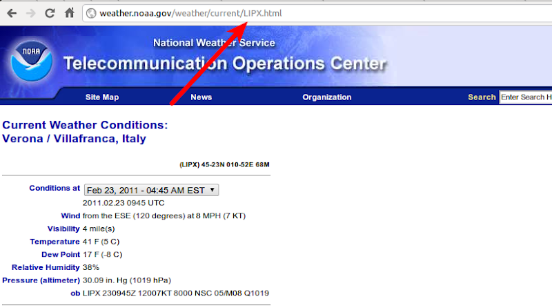 Scegliamo prima lo stato su International Weather Conditions, poi la nostra città su Current Weather Conditions a questo punto controlliamo l’url e salviamo le 4 lettere prima di .html (nel mio caso erano LIPX) e da terminale digitiamo: