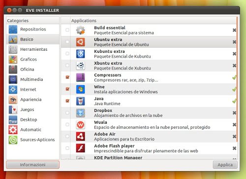 Tramite EveInstaller possiamo aggiungere i principali repository (Medibuntu, Getdeb, Playdeb Ecc) con un solo click, installare le principali applicazioni come Java, Docky, Awn, Compiz ecc ed inoltre aggiungere temi ecc per personalizzare la nostra nuova 11.04 Natty.