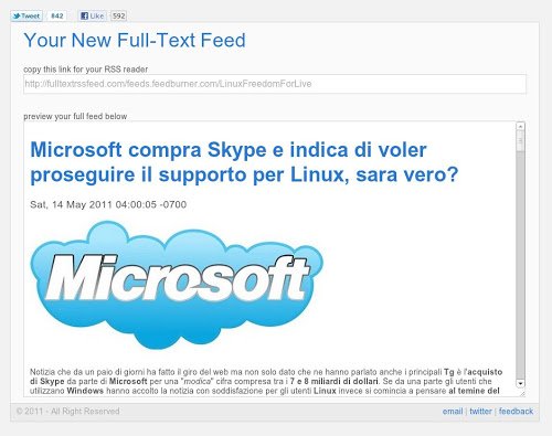 Full-Text Feed è servizio online gratuito che permette di avere feed completi e senza alcuna pubblicità partendo da uno preesistente. Semplicissimo da utilizzare basta inserire il feed originale nello spazio apposito e premere invio, dopo alcuni secondi verrà generata sia un’anteprima e un nuovo link da inserire nel nostro reader online o programma. Full-Text Feed funziona con qualsiasi tipologia di feed ed in caso di nuove notizie potremo leggerle complete e senza alcuna pubblicità.