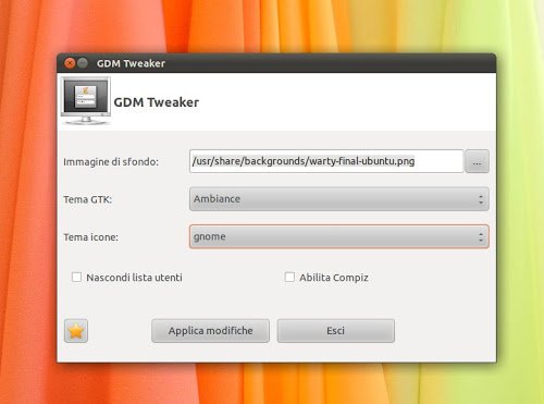 GDM Tweaker è un semplice tool con il quale possiamo personalizzare il nostro GDM cambiandone l’immagine dello sfondo, nascondere l’elenco di username, abilitare Compiz e cambiare l’icona della schermata di login o il tema GTK.