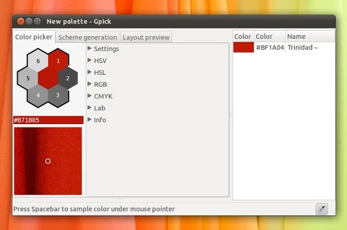 Gpick è un semplice ColorPicker specifico per ambienti desktop Gnome con il quale possiamo gestire i colori con molta facilità. Grazie a Gpick avremo a disposizione i più diffusi formati di colore come HTML, RGB, HEX, HSB/HSV, e HSL.