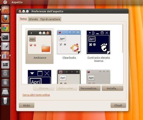 ora riavviamo Aspetto e sul tab Tema avremo i temi Ambiance e Radiance di Ubuntu Lucid