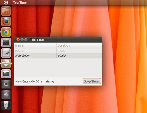 Creato appositamente per il nuovo Unity grazie al collegamento sul Launcher o barra laterale ci verrà indicato il tempo rimanente tramite una barra d’avanzamento al termine ci verrà notificata attraverso la classica notifica “a bolla” in alto a destra del nostro desktop. TeaTime, inoltre, ci permette di aggiungere più pause durante la giornata e di gestirle con molta facilità grazie alla semplice interfaccia.