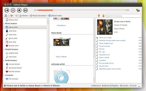 Grazie alla sua semplice interfaccia, Yarock permette navigare nella nostra collezione selezionando album, artista, brano, genere o cartella, si può facilmente trovare un artista o un album (e se ciò non bastasse, si può sempre utilizzare la barra di ricerca). A seconda della visualizzazione che stiamo utilizzando, è possibile trascinare un intero album o solo alcuni brani alla playlist sulla destra.