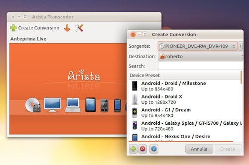 Arista Transcoder è un programma che consente di convertire i nostri file multimediali, nei formati dei più diffusi dispositivi portatili. Arista riconosce in automatico i dispositivi Video4Linux ed i DVD e molti altri dispositivi.