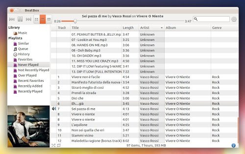 Tra le principali caratteristiche di BeatBox troviamo il supporto con Last.fm, il supporto per i principali file audio Mp3, Flac Ogg ecc e risce ad organizzare la nostra libreria musicale con molta rapidità.