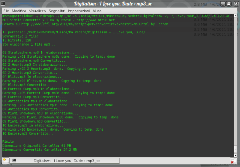 Lo script inoltre non riconverte un mp3 già ha 128 o appena convertito e alla fine della conversione mostra i mb occupati dopo la conversione.