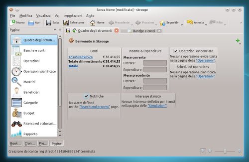 Con Skrooge potremo creare diversi account (magari uno per noi uno per la moglie ecc) da li potremo tenere traccia delle nostre entrate e uscite, verificare come sono spesi i nostri soldi e gestire i nostri investimenti e controllare come essi variano nel corso del tempo
