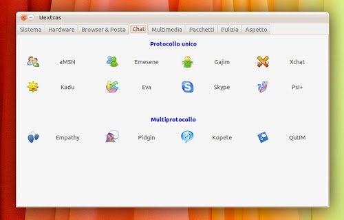 Per chi non la conoscesse Uextras è un’applicazione, scritta in Gambas, simile a Ubuntu Tweak, mediante il quale è possibile gestire, personalizzare, pulire ecc. il nostro Sistema Operativo. Semplice da utilizzare, una volta avviato (Applicazioni -> Strumenti di Sistema -> Uextras) o dal Dash digitando Uextras ci consente di installare con un semplice click le più diffuse e importanti applicazioni divise per sezioni quali Browser & Posta e Chat. Inoltre possiamo installare Java, Flash, i codec di Windows, i codec multimediali e i font per Windows tutto con 1 solo click.