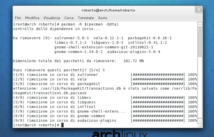 Come possiamo vedere dal comando daremo pacman -R seguito da  $(pacman -Qdtq) il quale ci indicherà i pacchetti inutilizzati da rimuovere.