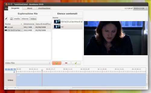 L’interfaccia grafica è molto simile allo standard di tutti i software di editing video, con una timeline posta in basso, mentre la parte centrale della finestra principale è occupata da un riquadro per l’anteprima, e due colonne per selezionare i contenuti da andare poi ad inserire all’interno del proprio DVD. Attraverso Bombono DVD possiamo anche aggiungere menù di diversi tipi, ed esportare il tutto anche in formato ISO, da masterizzare in seguito su un supporto DVD.