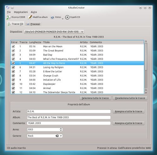 L’utilizzo è semplicissimo inseriamo il cd audio nel nostro lettore e avviamo KAudioCreator e scegliamo il nostro Dispositivo, automaticamente cercherà in rete i dettagli dell’album e in pochi secondi avremo già il nostro album dettagliato pronto da estrarre.