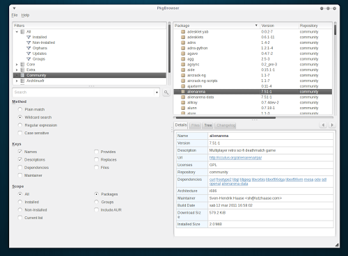 Grazie alla semplice interfaccia possiamo consultare il database aggiornato dei repository Core, Extra, Community e AUR il tutto tutto ben dettagliato e semplice da utilizzare e gestire. Ci permette di conoscere e consultare tutti i pacchetti installati nella nostra Distribuzione, una volta selezionato un pacchetto ci permette di conoscerne l’entità, dettagli, home del progetto e perfino i file e cartelle contenuti