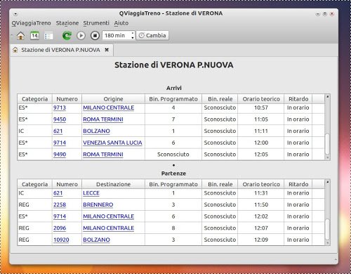 Scegliamo la stazione cliccando su QViaggiatreno -> Stazione e inseriamo la stazione da monitorare (per esempio Verona) ci appariranno tutte le stazioni di Verona e scegliamo quella preferita ed ecco tutti i treni in arrivo e partenza. Inoltre possiamo effettuare ricerche mirate su singolo treno e inserirci l’intervallo d’aggiornamento.