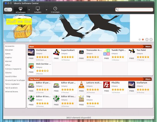 Nel nuovo Ubuntu Software Center rimane invariato come funzionamento ossia possiamo vedere le applicazioni disponibili in base alla loro categoria o fare velocemente ricerche in base al nome o alla descrizione. Inoltre possiamo anche esaminare le applicazioni già installate e rimuovere quelle di cui non si ha più bisogno.