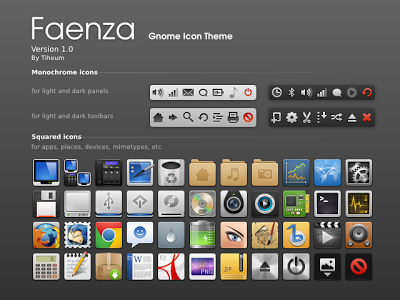 Il set di icone Faenza forniscono icone monocromatiche per i pannelli, le barre degli strumenti e pulsanti, invece icone colorate per i dispositivi, applicazioni, cartelle, file e voci del menu di Gnome.