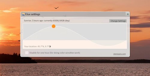 Molto semplice da configurare F.Lux attraverso la latitudine e longitudine della nostra posizione riesce ad impostare la luminosità del nostro schermo conforme le varie ore della giornata per esempio nelle prime ore del giorno un vivo colore bluastro ad arrivare ad un colore vicino all’arancione durante le ore serali.