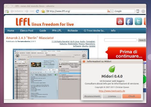 Per installare Midori 0.4.0 su Ubuntu 11.04 Natty, 10.10 Maverick e 10.04 Lucid integreremo i PPA Midori per farlo basta avviare il terminale e scrivere: