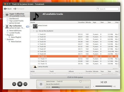 Tomahawk viene realizzato in QT quindi ci permette una perfetta integrazione su qualsiasi ambiente desktop quali Gnome, Kde, Xfce e Lxde. Particolarità di Tomahawk è la compatibilità con Playdar che permette di ascoltare tutti i file audio presenti sul vostro computer, servizi online e altro ancora e di effettuare ricerche sul disco locale su una rete di casa o in ufficio o altre fonti. Inoltre permette di creare o importare playlist e aggiunge anche la ricerca intelligente di file per genere , artista durata ecc.