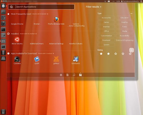 Altra novità arriva dal tasto per avviare il Dash integrato di recente nel Launcher il quale rimuove l’icona rossa per inserirne una nera con il logo Ubuntu in grigio (secondo me molto meglio del predente).