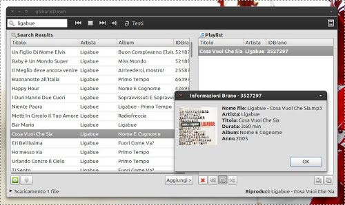 gSharkDown 0.4 presenta un‘interfaccia completamente rivisitata e molto più intuibile. I pulsanti sono stati rivisitati e alcuni spostati in basso ad esempio sotto la finestra a sinistra dedicata alla ricerca troviamo il tasto info e download, sotto la finestra a destra troviamo la gestione dei plugin. Aggiunto anche il tasto “testi” con il quale possiamo leggere il testo del brano in ascolto grazie al servizio offerto da Lyrics.