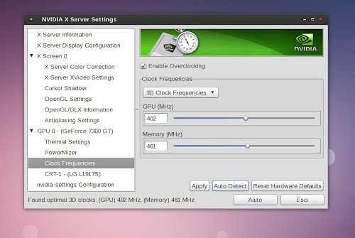 Avviamo NVIDIA X Server Settings e ora avremo la nuova opzione Clock Frequencies clicchiamoci sopra e attiviamo su Enable Overclocking e su select selezioniamo 3D Clock Frequencies a questo punto possiamo o impostare le frequenze noi oppure cliccare su Auto Detect dopo alcuni minuti troveremo la configurazione corretta e clicchiamo su Apply per confermare.