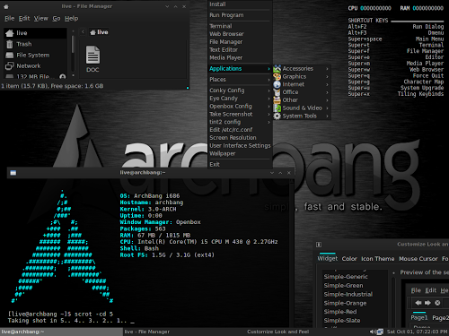 ArchBang 2011.10 aggiorna il Kernel Linux alla nuova versione 3.0.4-1 e aggiorna all’ultima release stabile tutti i pacchetti integrati, tra questi troviamo Firefox nel canale Nightly. Nel nuovo ArchBang 2011.10 troviamo le icone delle applicazioni nel menu e altre correzioni varie del tema.