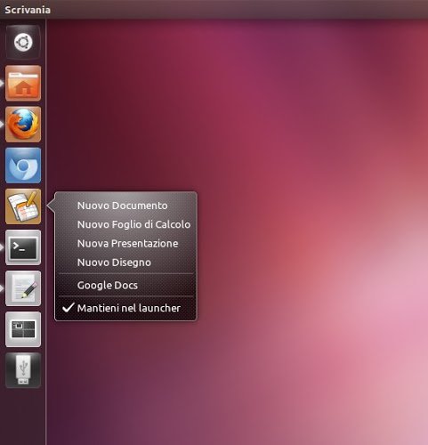 Su Ubuntu è presente di default LibreOffice una suite completa e libera anche se molti utenti amano utilizzare Google Docs, in questo caso abbiamo realizzato una semplice QuickList dedicata al servizio offerto da Google con la quale possiamo accederci direttamente dal nostro Launcher.
