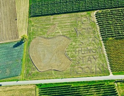 In onore a Steve Jobs, proprio qui vicino a dove abito, l’artista Dario Gambarin ha creato una nuova mega opera sul suo proprio terreno agricolo disegnando con la famosa Mela Morsicata logo di Apple con la famosa frase “stay hungry, stay foolish” ossia siate affamati, siate folli il tutto con l’aratro del proprio trattore.