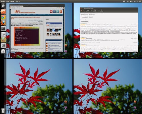 Una particolarità di Linux è di poter gestire le proprie finestre su più Spazi di Lavoro aumentando cosi lo spazio di lavoro disponibile sopratutto quando abbiamo molte finestre aperte. Sul nuovo Ubuntu 11.10 Oneiric di default avremo a disposizione ben 4 Spazi di Lavoro che possiamo visualizzare tutti insieme grazie al tasto dedicato posto nel nostro Launcher o barra laterale.
