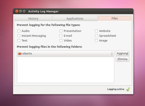 Activity Log Manager è una semplice utility con la quale possiamo cancellare parte o per intero la cronologia di Zeitgeist. Grazie ad una semplice interfaccia possiamo quindi operare sulla cronologia di Zeitgeist rimuovendone alche solo alcuni file come ad esempio siti, audio, documenti ecc.
